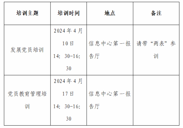 1.发展党员培训专题,请提前准备《中国共产党入党积极分子和发展对象培养教育考察登记表》、《中国共产党预备党员教育考察鉴定表》参加培训。